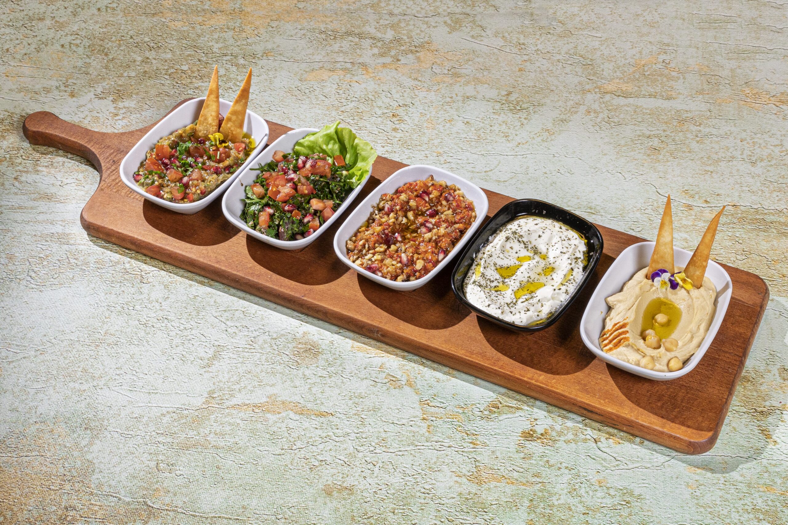 -focaccia (faina,ulei ,sare ,zahar alb ,drojdie), HUMUS 150g (naut,tahina,ulei de masline ,sare, sare de lamaie), MUTABAL 150g (vinete, iaurt,tahina,rodie,ulei de masline,patrunjel, sare de lamaie, sare), LABNEH 130g (iaurt,lamaie,ulei de masline ,sare, menta ), TABOULEH 100g (sare ,rodie ,sos de rodie, bulgur, rosii, lamaie, salata verde, naut, ceapa,ulei de masline ,sumac, patrunjel ), masline 80g, ulei de masline , usturoi, ardei, oregano