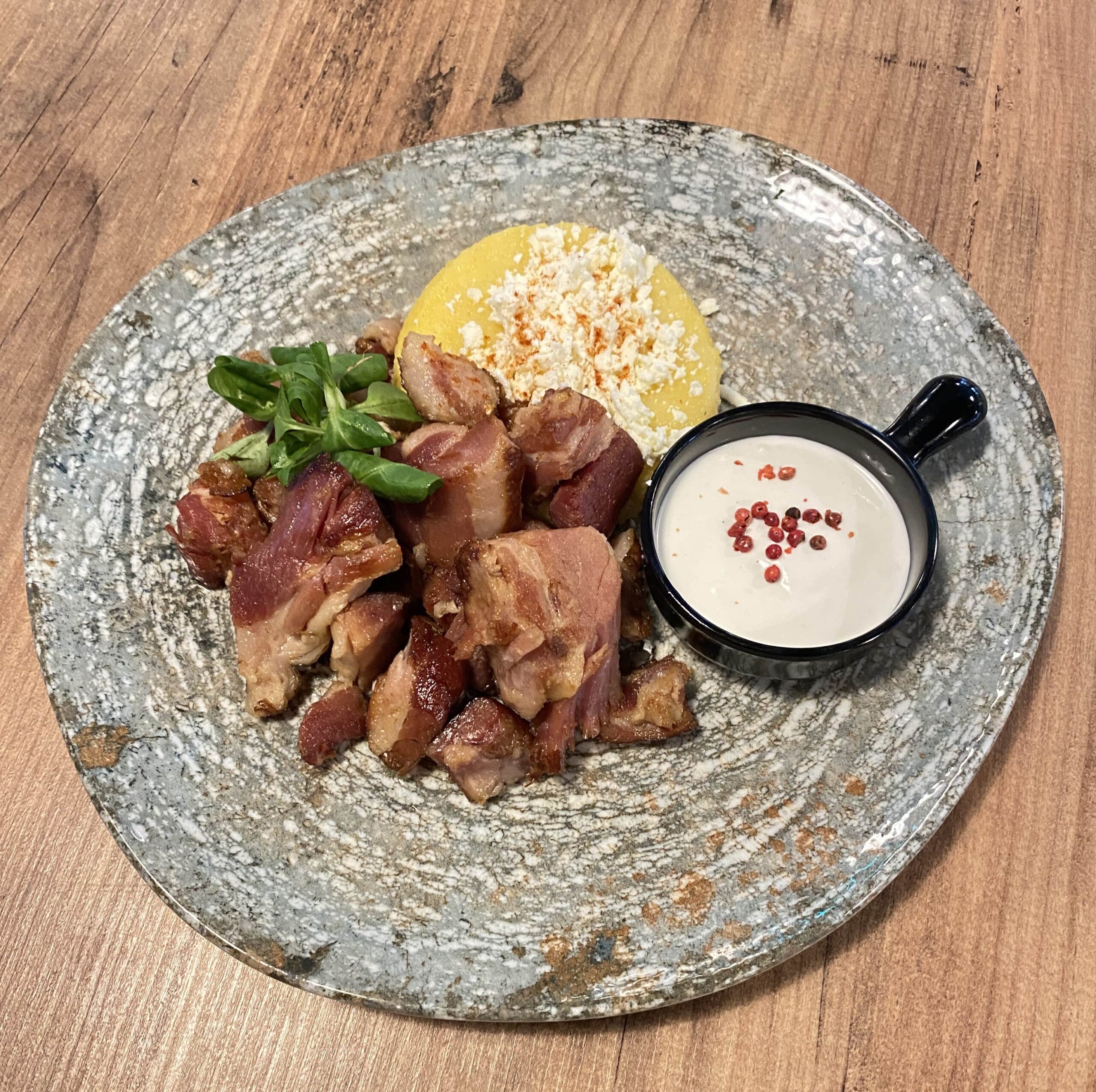 -pulpă de porc, usturoi, telemea, mamaligă, ceapă