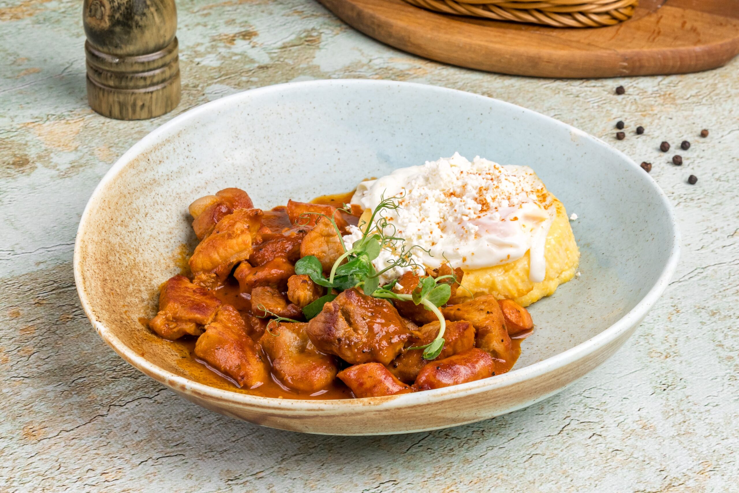 -cotlet de porc, carnati de porc, usturoi, vin alb, sos de rosii, branza telemea, mamaliga